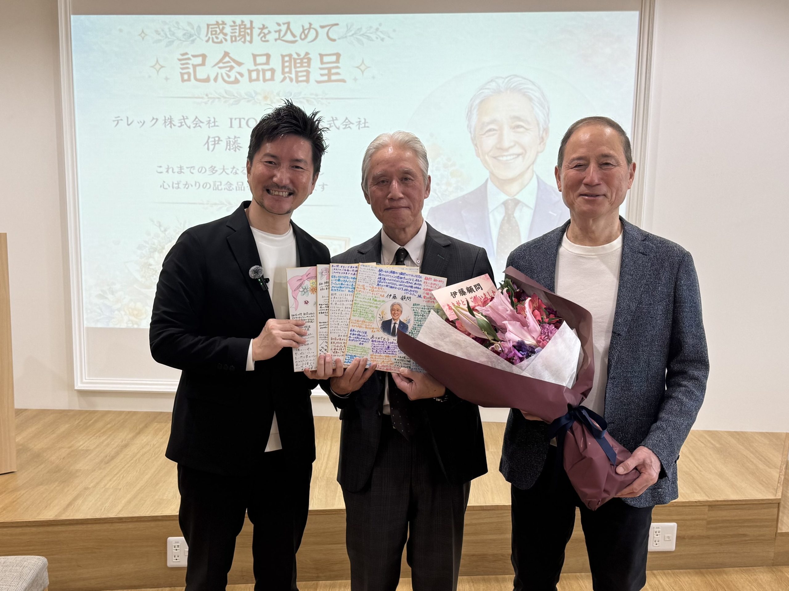 セレモニーでは、会長および代表より、伊藤顧問とのこれまでの歩みを振り返る言葉が贈られました。これまでの一つひとつの積み重ねと、変わらず向き合い続けてきた姿勢に、改めて深い敬意が寄せられました。