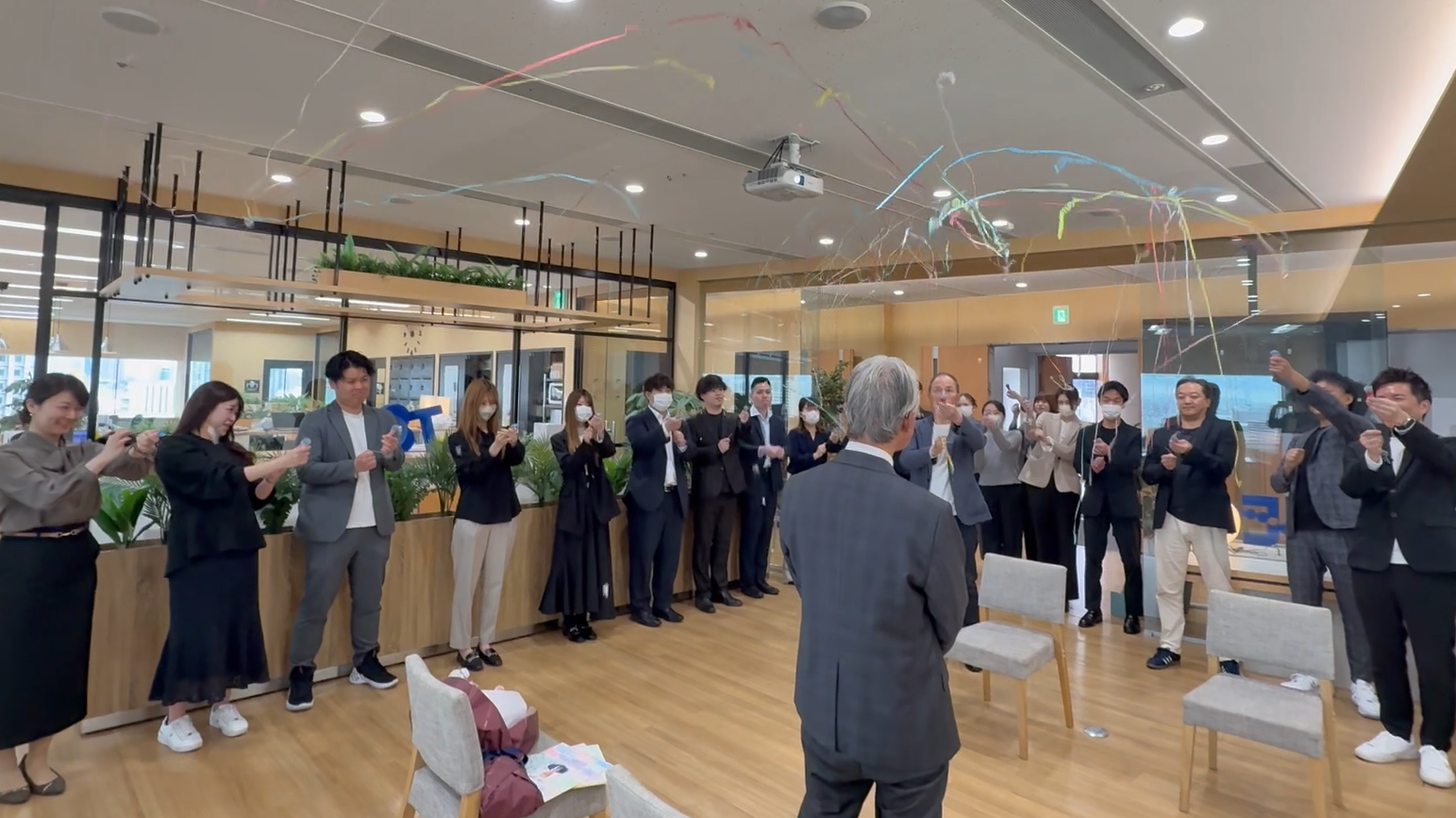 伊藤顧問よりご挨拶をいただき、これまでの歩みや関係者への感謝の言葉が述べられました。その後、社員によるクラッカーでの演出が行われ、会場は一層和やかな雰囲気となりました。